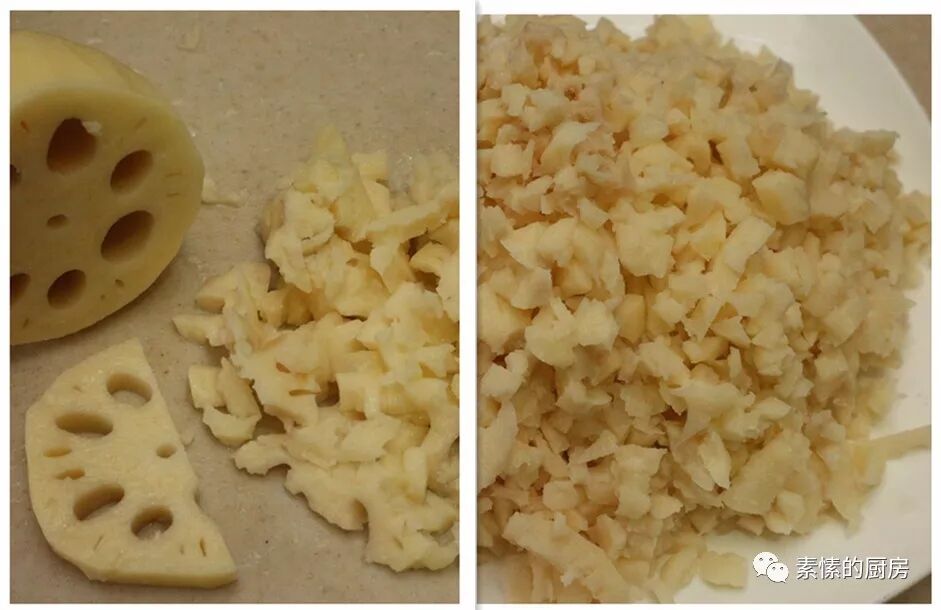 4.藕去皮,切成半圆形的片或小条,用刀略微拍碎。不用拍得粉碎,大致有部分破碎即可,这个步骤可以让口感更好,再切成细碎粒,