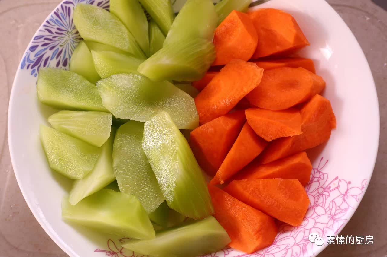 2.莴笋胡萝卜分别去皮,切成滚刀块。比图中切瘦一点,易熟。