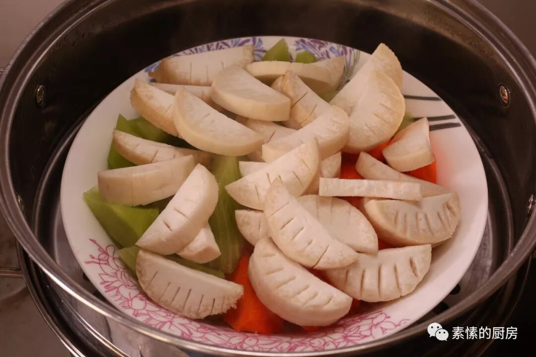 3.杏鲍菇先切成半圆片,再切成梳齿状。摆放在面上,均匀撒些盐,在开水锅上蒸熟。(用双层蒸锅,1,3步一起蒸)。