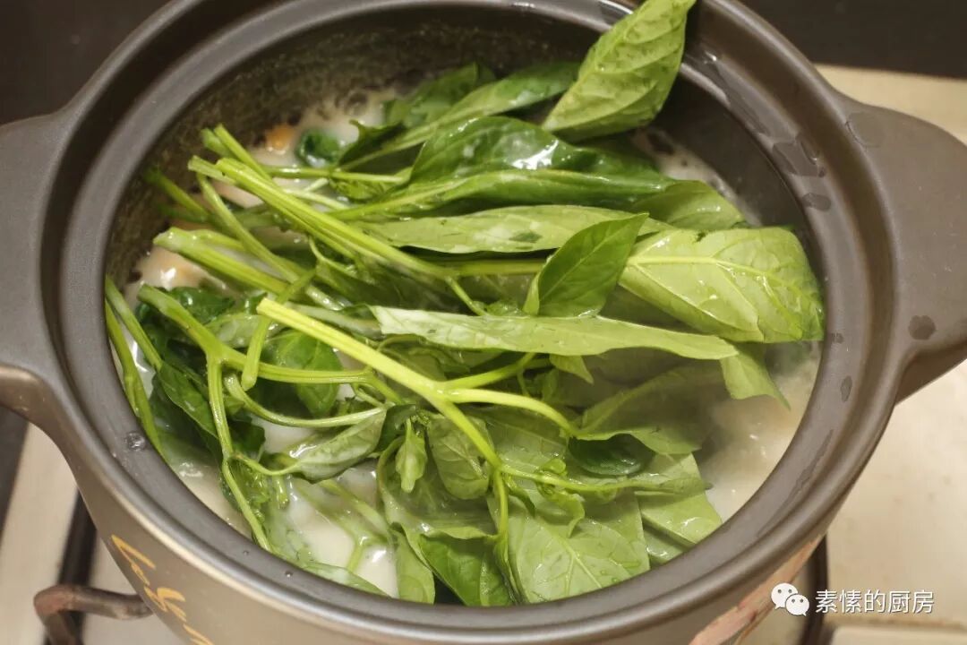 4.煮开后,将摘好洗净的辣椒叶放入,待再煮开即可停火。辣椒叶嫩的话,叶柄也是好吃的。