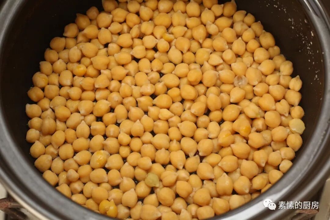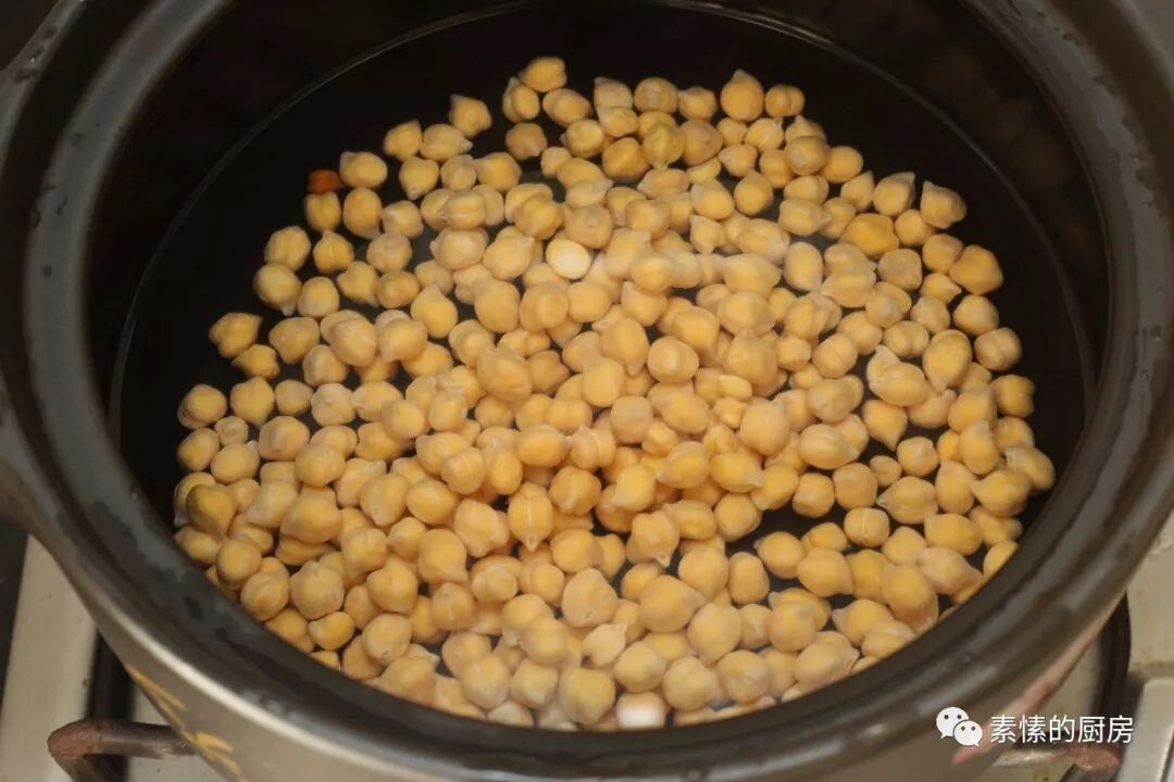1.鹰嘴豆泡一晚或更久,至豆子饱满,倒掉水冲洗干净(天热中途要换水,可一次多泡点,放冰箱冷冻保存)。加水在锅里煮熟,约20-30分钟。