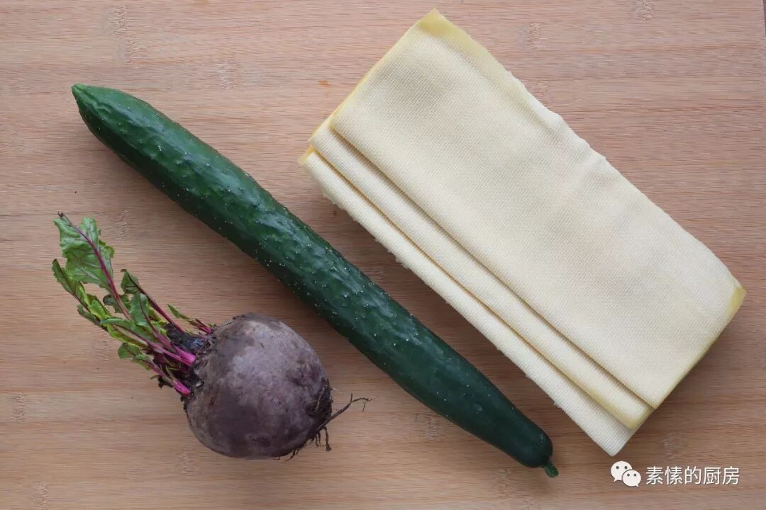 大的甜菜根半个,青瓜一根,千张皮三张,正好用完。