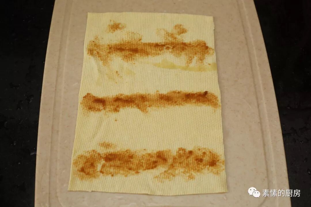 4.把一张千张皮切开成4等份,或者自己喜欢的大小。涂上一些酱,不用全部面积都涂满,只要卷好后每一口都有酱就可以了。