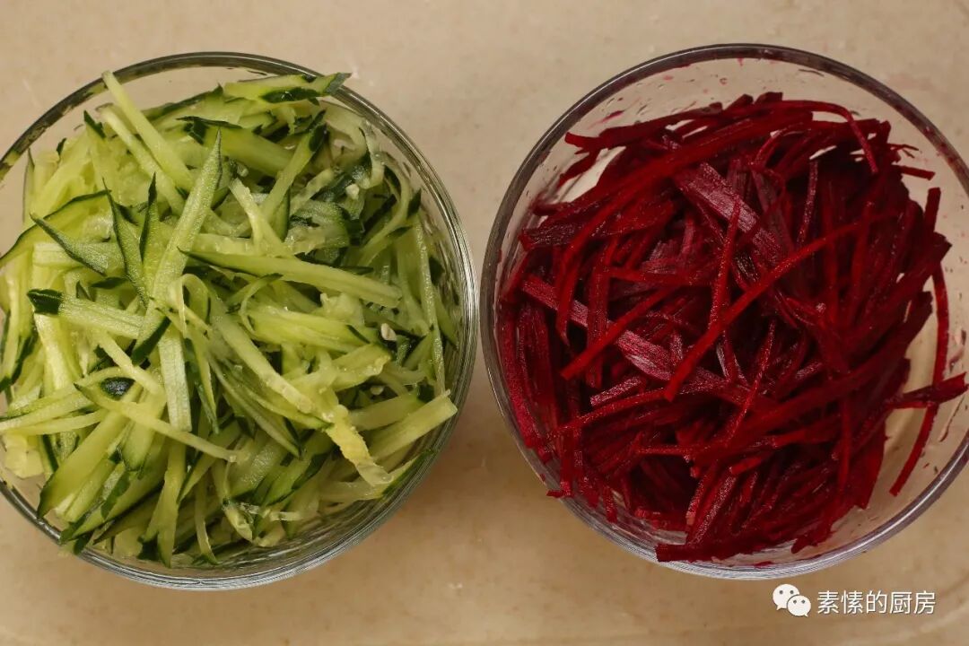 1.青瓜洗净,甜菜根削去外皮,分别切或擦成丝。如果用擦丝板,青瓜不用擦得最细,以免出水太多,甜菜根则尽量地细。