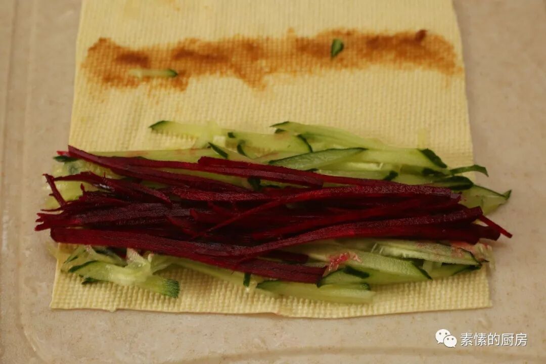 6.铺上甜菜根丝。十分介意甜菜根味道的,就放少点,使之尽量卷在青瓜中间,不介意的就随意。