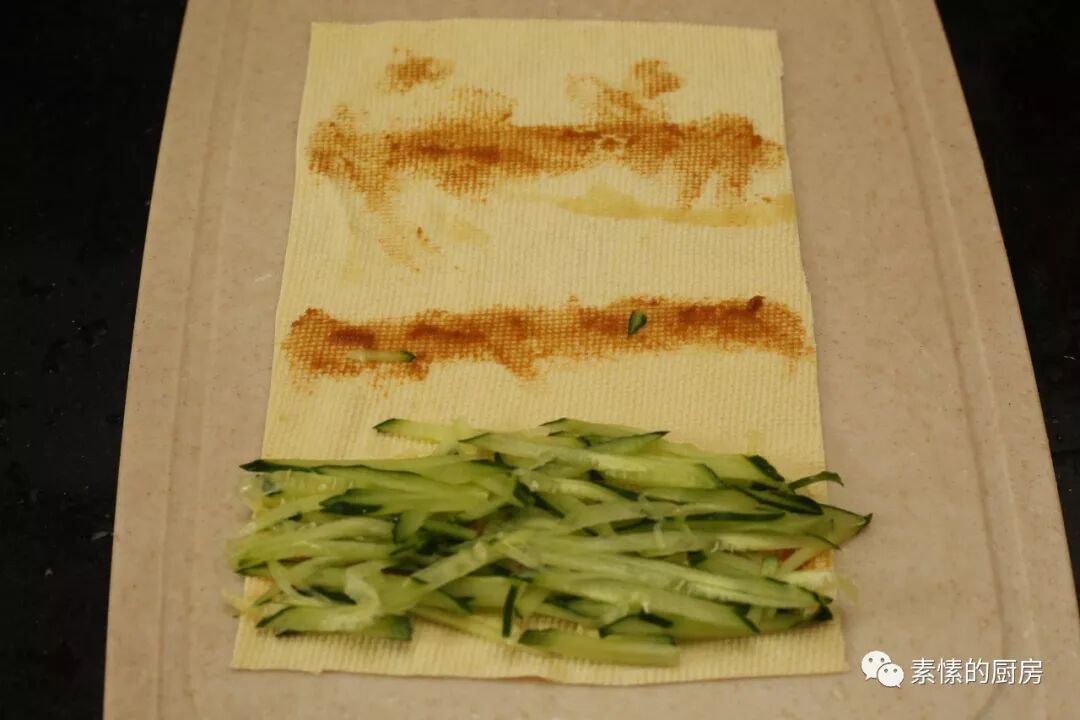 5.铺上青瓜丝,大约占千张皮1/4长度的地方。