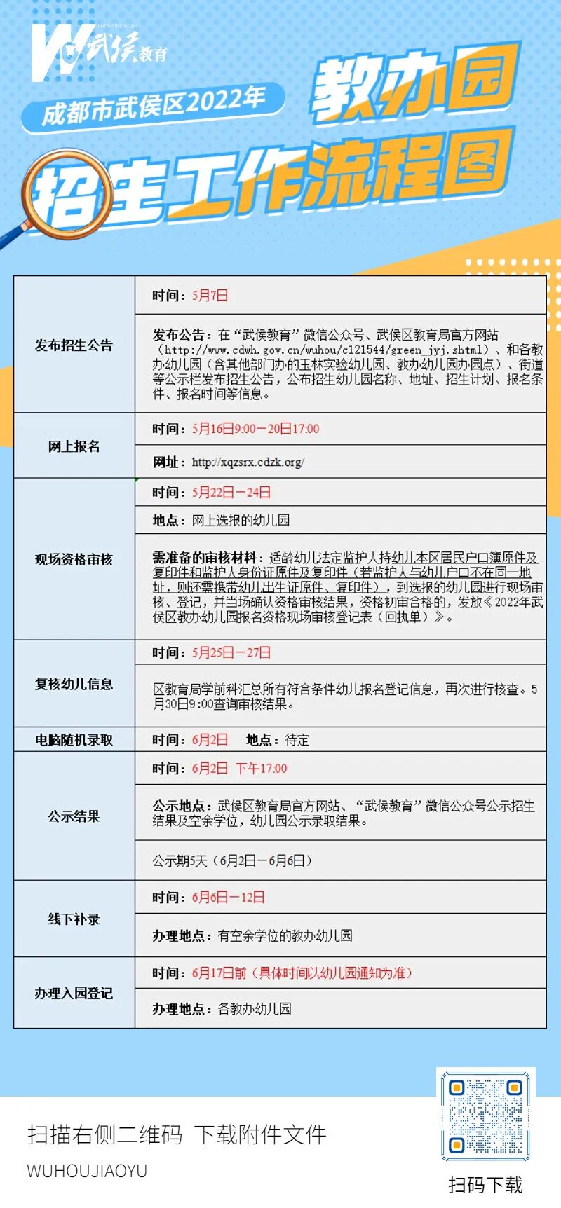 6月2日17:00公布录取结果。武侯区教育局官方网站、“武侯教育”微信公众号公示招生结果及空余学位,幼儿园公示录取结果。公示期5天(6月2日—6月6日)