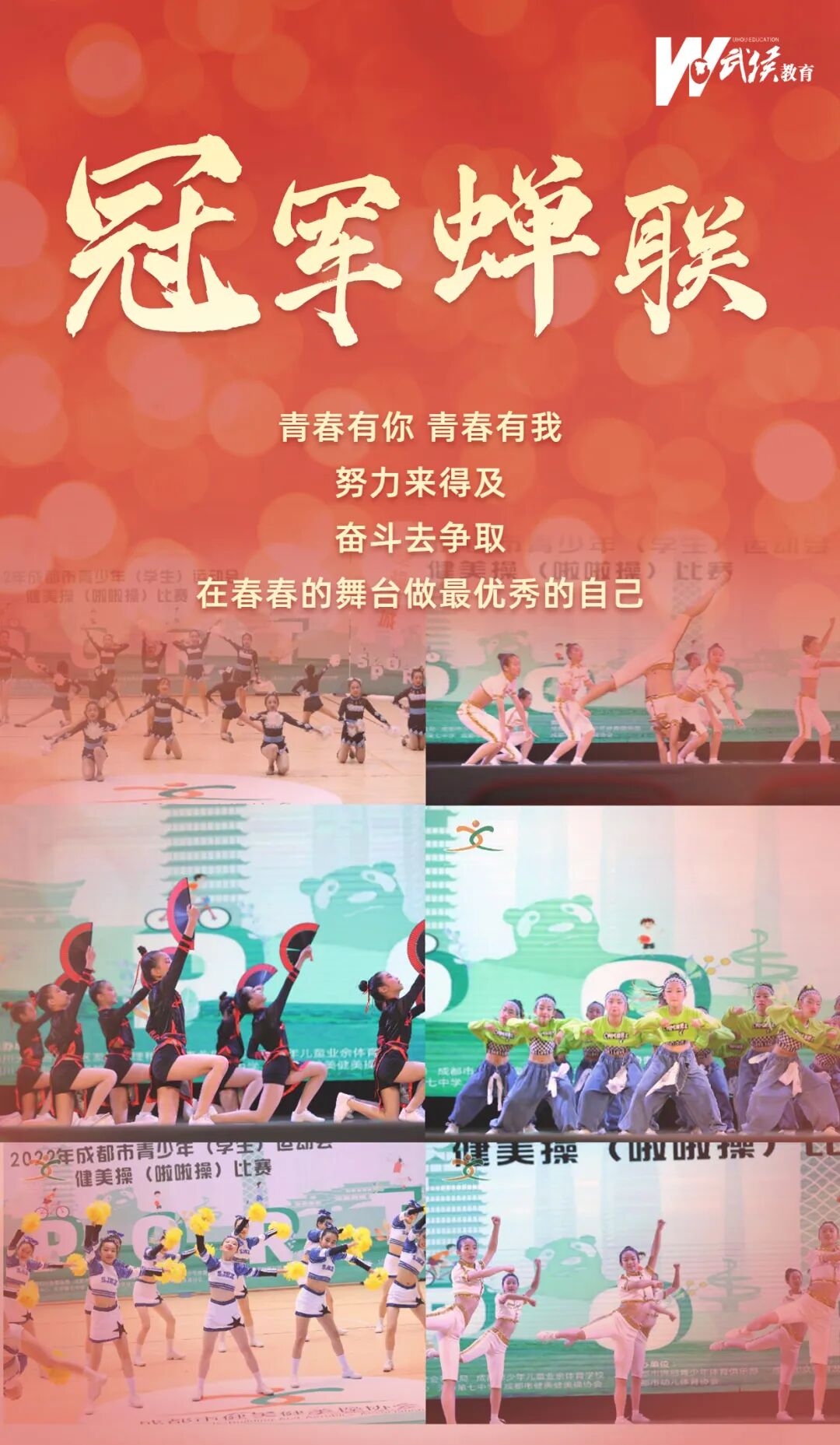 近日,由成都市体育局、成都市教育局主办的“希望之星”2022年成都市青少年(学生)运动会健美操(啦啦操)比赛落下帷幕。武侯区健美操(啦啦操)学生代表队共获得2枚金牌,2枚银牌,2枚铜牌,以团体总分第一的佳绩,蝉联冠军。