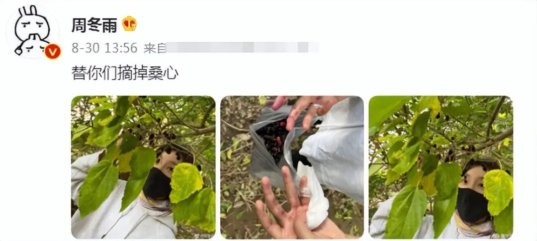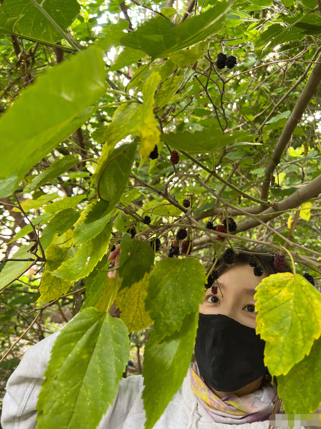 当天周冬雨收获满满,同样摘了一大袋桑葚,双手都被染上了颜色。