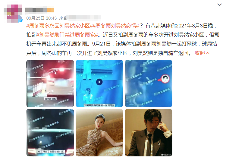 9月25日,周冬雨多次回刘昊然小区被拍,两人疑似恋情曝光。