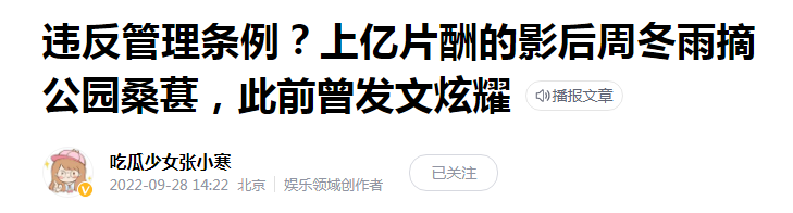 9月28日,有媒体曝光出周冬雨恋情曝光后的近况,露面的她现身公园摘桑葚,摘了满满一袋子,心情很不错的样子,但该行为违反了公园管理条例,画面曝光后引发热议。