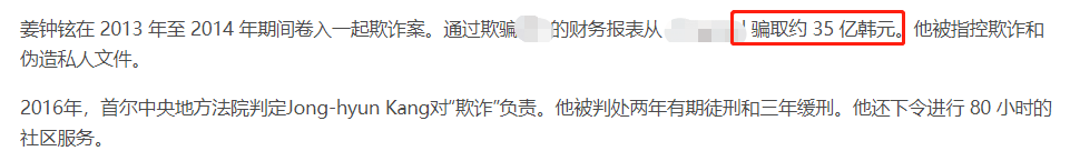 但非常奇怪的一点是,姜钟贤曾在2013年至2014年期间卷入了一桩诈骗案,骗取了35亿韩元(约1760万人民币),并于2016年因欺诈被判有期徒刑两年。