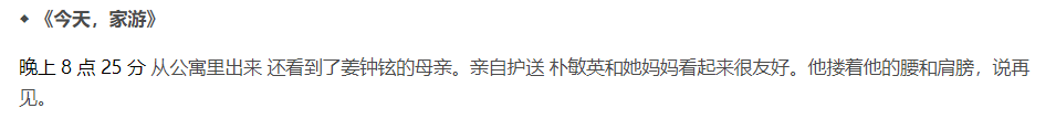 与家人见完面后,两人从公寓离开,姜钟贤的妈妈亲自出来送行,亲密地搂着朴敏英的腰和肩膀说再见,看上去关系很不错。