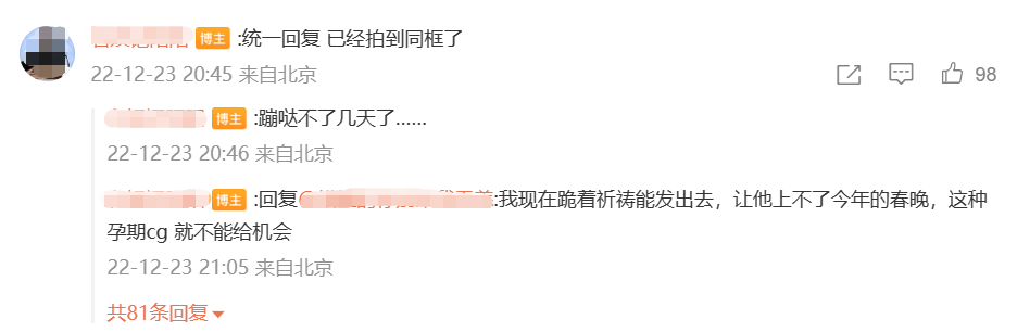 娱记的评论区十分热闹,首先他在评论区里说的是:“统一回复,已经拍到同框了,蹦跶不了几天了”,他还说道:“我现在跪着祈祷能发出去,让他上不了今年的春晚,这种孕期cg,就不能给机会”,看来信息量还是很大的,该一线小生似乎经常上央视春晚,人气还是颇高的。