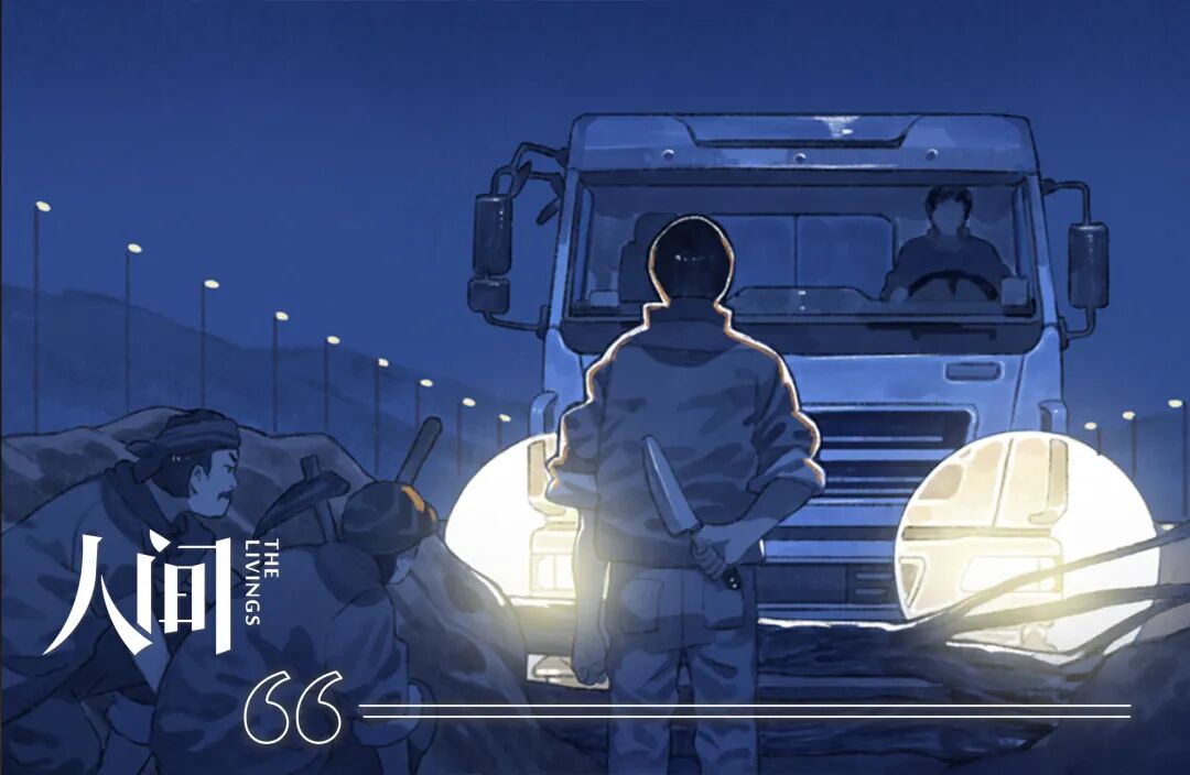 向爹说,一次子夜,他疲惫极了,归心似箭,后座的搭档睡着了,山风在拍打车窗玻璃。他远远看见国道上横了一截枯木,周围的树丛草堆里似有人影幢幢,顿时警醒,只觉大事不妙。但满载的货车无法掉头,他只能笔直往前。