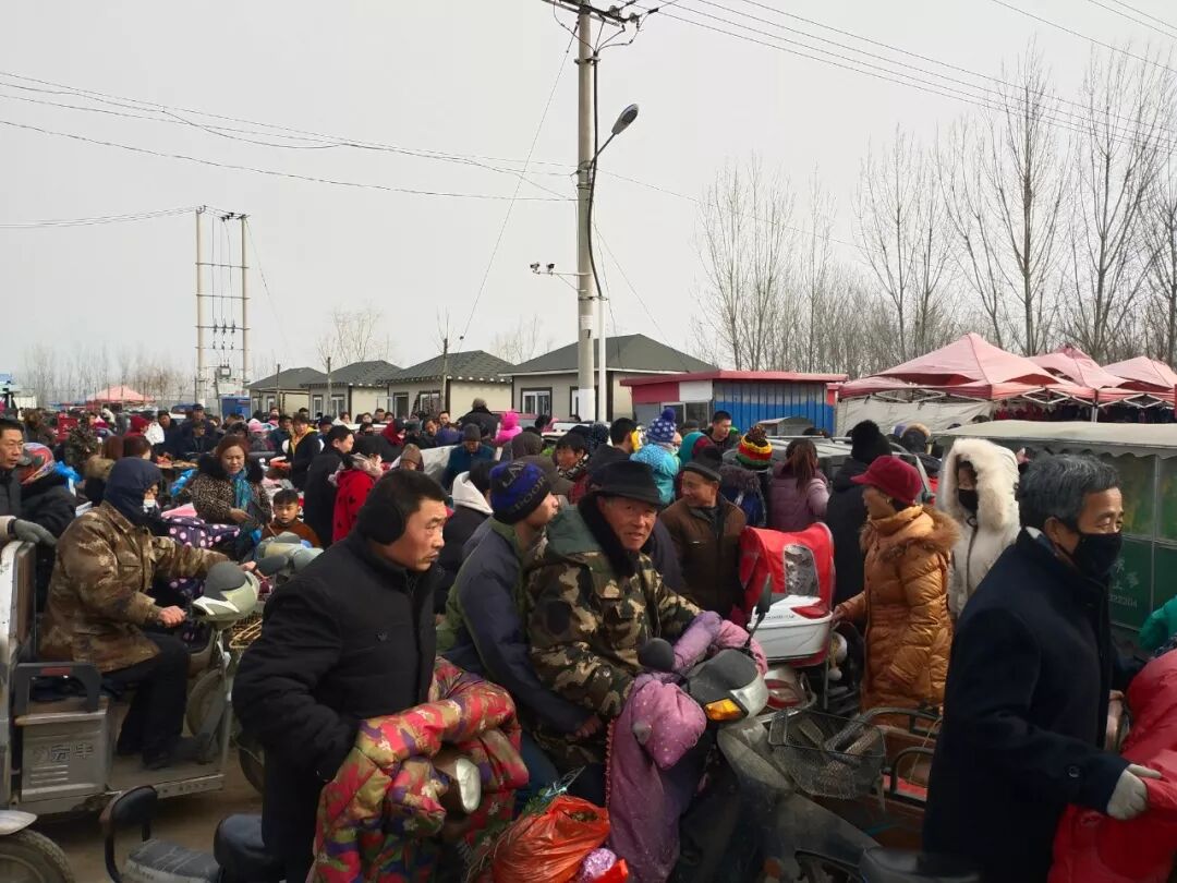 我的家乡太平村(化名),位于鲁东南三县两市交界处,是一个拥有500年历史、600多户2000多口人的普通北方村庄。庚子年初一,是离太平村917公里外的武汉封城的第3天,也是太平村封村的前一天。95岁的太奶对我说,她这一生,见过漫山遍野的蝗虫灾、大雨漫漶的水灾、覆盖村庄的雪灾,而肆虐南北的疫情真是极少见。尽管相距甚远,但太平村的空气里依然能嗅到那份不安的气息。疫情就这样不知不觉地笼罩在了村庄的上空。大年初一凌晨2点半,母亲将我从睡梦中晃醒。按照春节前母亲请算命先生给看的日子,在这个时刻,要带着叠好的元宝和纸钱,在太平村的重要路口烧纸焚香磕头,保佑家人平安。睡眼惺忪的我胡乱地穿好衣服,按照母亲的指示带好纸钱,再拿出两天前从大集上购买的炮竹,悬挂在院门口的石墙之上。| 腊月29日,人头攒动的太平村大集。(作者供图)打开手电筒照着土路,我和母亲一起前往村子西边的大街。