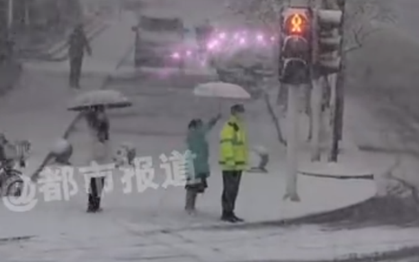 2、等红灯女孩冒雪给交警撑伞被敬礼 18日,天津宝坻漫天飞雪,两名女孩在等红灯时看到交警淋雪执勤,其中一人悄悄走到交警背后,踮脚在他头顶上空撑起了伞。随后,被善意温暖的交警目送女孩们离开,并郑重地敬了一个礼。(@都市报道)