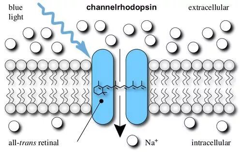 一般来说,能够导致神经元产生冲动的,只有神经元细胞膜上离子通道(ion channels)的开合——这些离子通道可以让带电荷的离子进出细胞。戴塞尔罗斯和博伊登则另辟蹊径,想要让他们的大鼠神经元同时也能被光线激发。这项技术中的核心一环则是一种叫做“光敏感通道”(channelrhodopsins)的光敏蛋白[1]。光敏感通道能被光线打开,因而导致神经元发射出电信号。