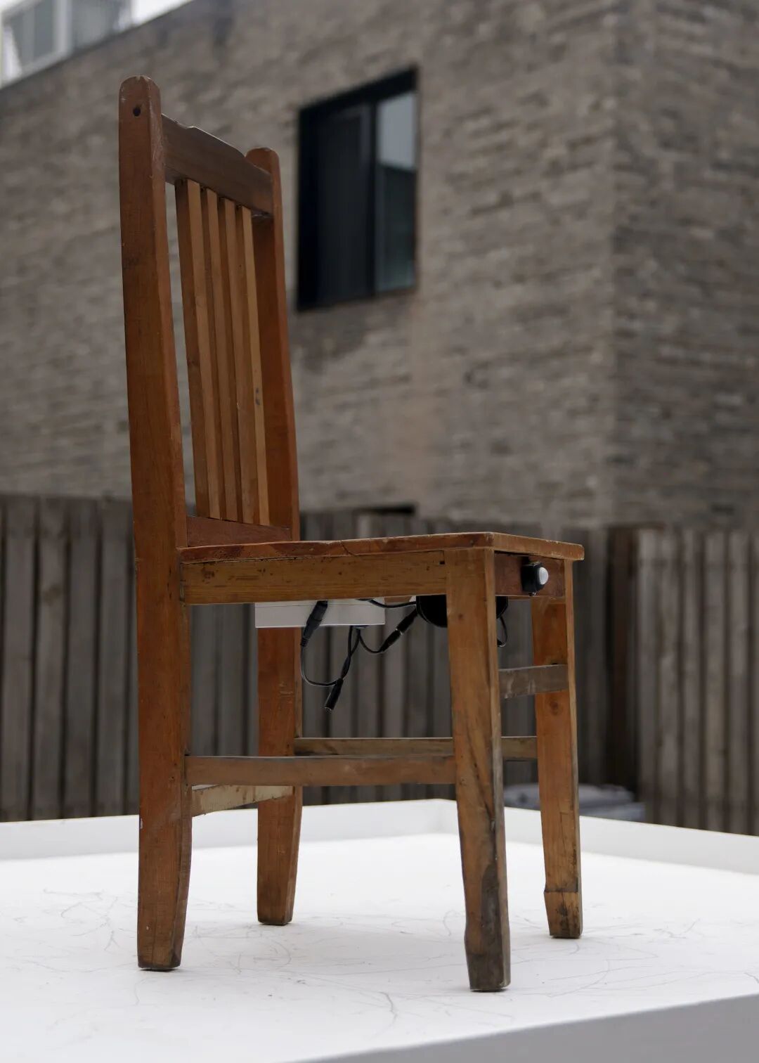 苍白的纪念碑式台面上,一把以极高频率颤动的椅子取代了本应出现在这里的崇高雕像。宏大叙事的意义崩解,艺术家试图通过这滑稽荒诞的场景来呈现我们坐立难安的状态。