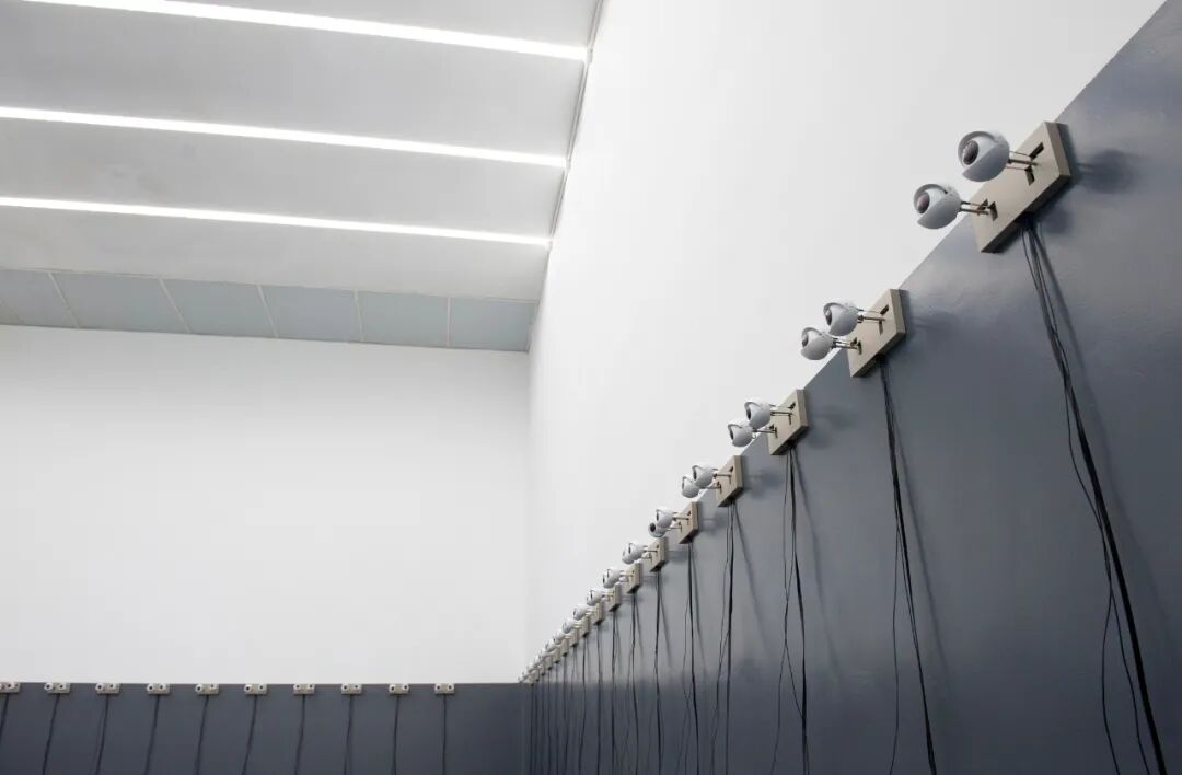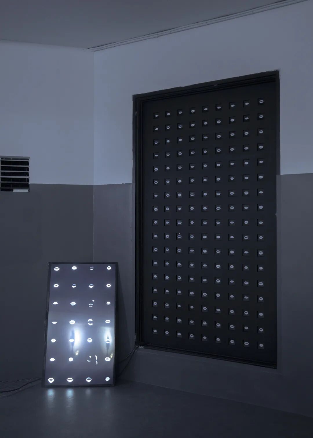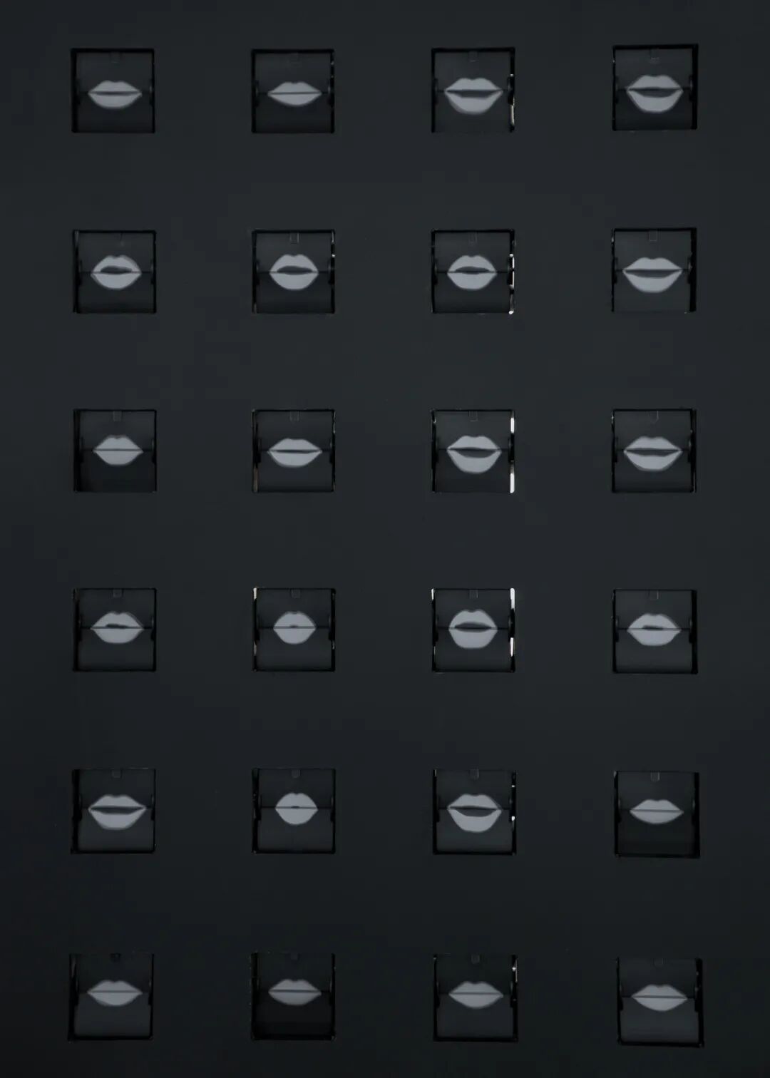 无数个翻页高速转动,形成充满迷幻感的动态效果。黑色扇叶上用白色描绘出艺术家的嘴:朝向空间外的立面不断重复着「我愿意」的口型,而向内的一面则在说出相反的内容。但无论是虚与委蛇的接受还是义正言辞的拒绝,都被这黑色矩阵所吞噬,只剩杂乱的虚无之声。
