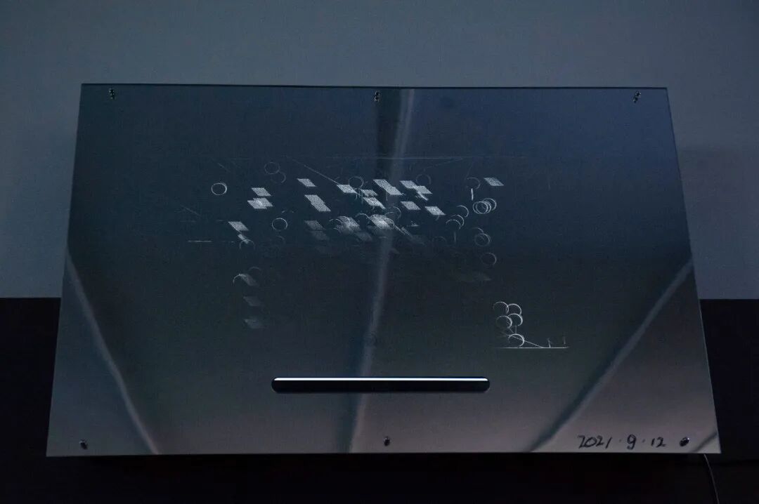 请以如下方式使用这件作品:1. 笔直站立在作品前1米处;2. 注视镜中的形象;3. 缓慢移动眼球,时刻留意镜面的划痕;4. 试着停下目光,凝视任意一点(ps. 等待,等待,请多一点耐心)。