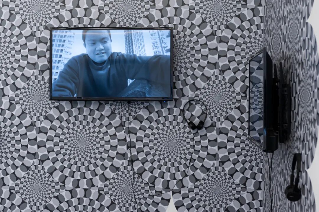在展示方面,我希望既能给整个项目一个整体的视觉印象,同时还能激发观者的身体感觉。最终选择了视错觉图像作为背景。这也是对话语场域的图像化譬喻。
