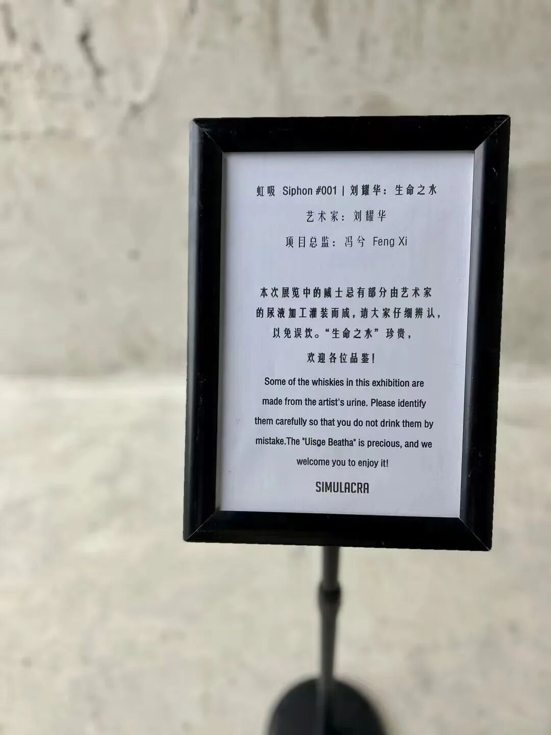 刘耀华《生命之水》作为虹吸项目首展已于8月27日下午3点在SIMULACRA开幕,并于次日撤展。艺术家将画廊空间布置成一个酒会的形式,邀请前来的观众进行威士忌品鉴。酒会上的数十瓶威士忌中覆盖了苏格兰、爱尔兰、日本、中国等各个国家、产区,以及不同年份,但其中有部分是由艺术家的尿液加工灌装而成,从视觉上难以分辨。为了使别人不能通过嗅觉容易辨别,刘耀华甚至使用了“威士忌香精”来压制尿的气味。这就像是一个观念的剧场,一个心理游戏的实验,不同的人面对这场酒会也表现出非常不同的反应。