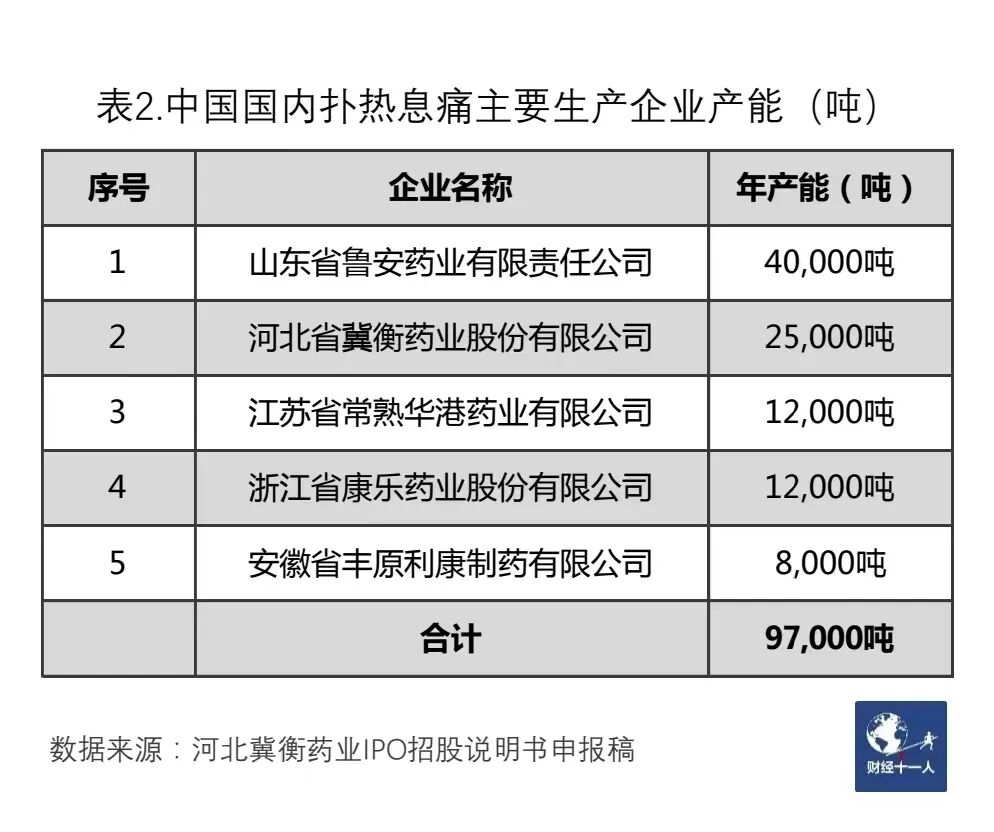 “扑热息痛”是Paracetamol的中文音译,即对乙酰氨基酚,是全球最常用的非抗炎解热镇痛药,被WHO列入《世界卫生组织儿童基本药物标准清单》。2022年7月,扑热息痛生产商之一的河北冀衡药业股份有限公司,递交了IPO招股说明书申报稿。该申报稿透露,全球扑热息痛的产能约为19万吨,供应商主要有山东潍坊鲁安药业、河北冀衡药业、Mallinckrodt Pharmaceuticals(马林克罗制药)、安徽丰原药业(000153.SZ)等等,国内主要公司扑热息痛产能,超过全球总产能的一半,见表2。