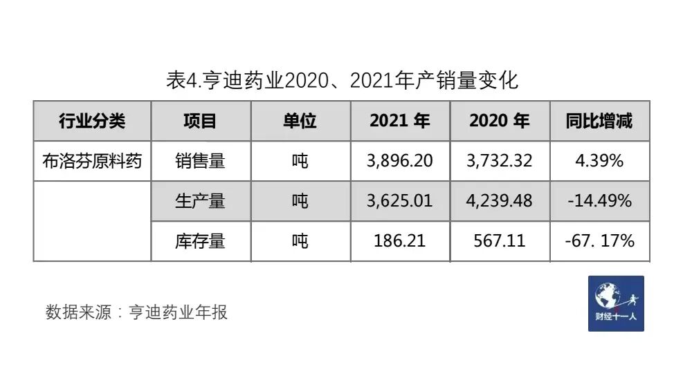 从表4可以看出,2020年亨迪药业的产量达到了4239吨,是设计产能的121%,亦是弹性十足。亨迪药业的招股书显示,布洛芬原料药的上游产品异丁基苯,需要从印度两家公司进口。该产品的生产技术难度并不高,但两家印度公司因为研发和生产历史较长,已经形成了全球供应的规模优势和成本优势——这是国内布洛芬原料药增产的一大掣肘。《财经十一人》从新华制药和亨迪药业的证券部了解到,两家公司都有大量海外订单,必须保证海外长协大客户的供应,不能违约,其产能无法全部用于国内市场。2022年上半年,新华制药和亨迪药业的海外收入占比,分别为33.41%和54.82%。两家公司均表示,已在加班加点保供应,产能会陆续跟上。