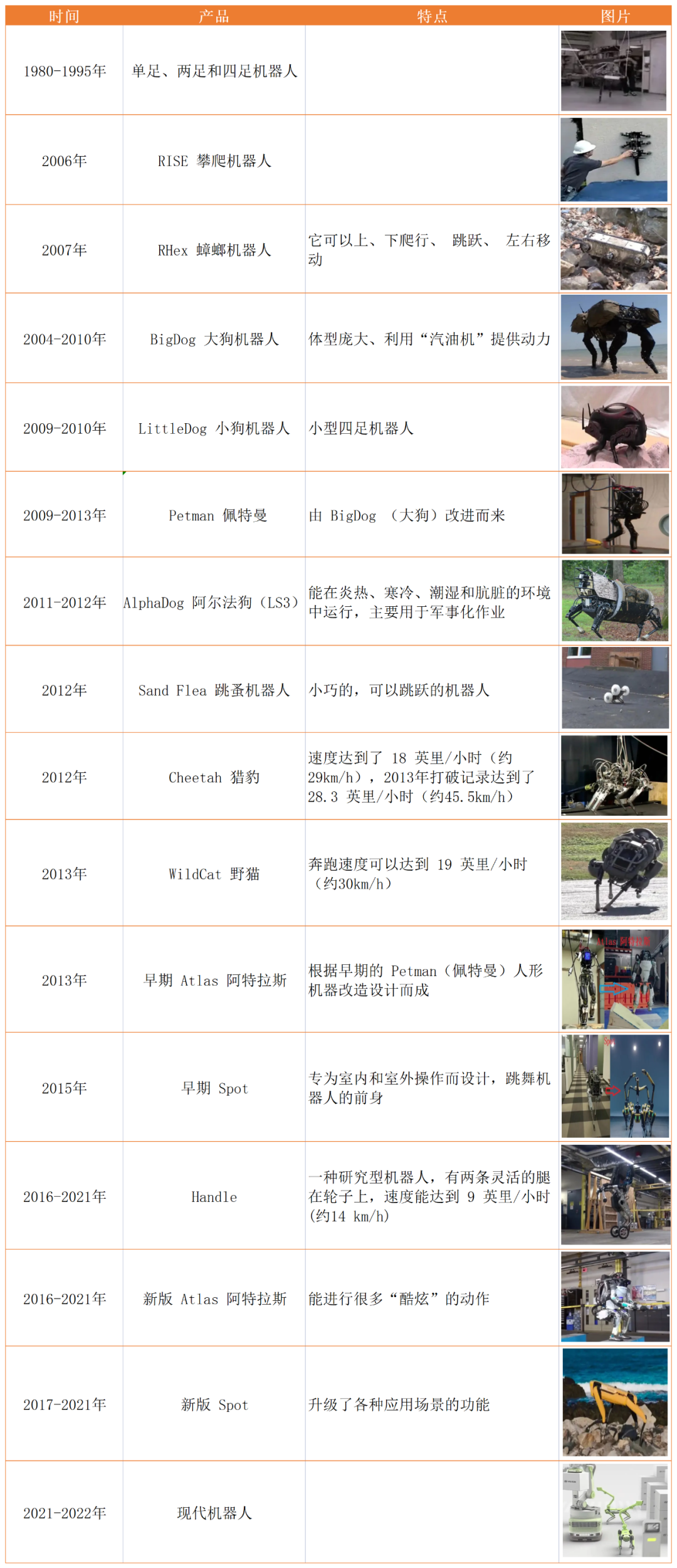 我们通过一张表格看一下波士顿动力这些年的产品变化。
