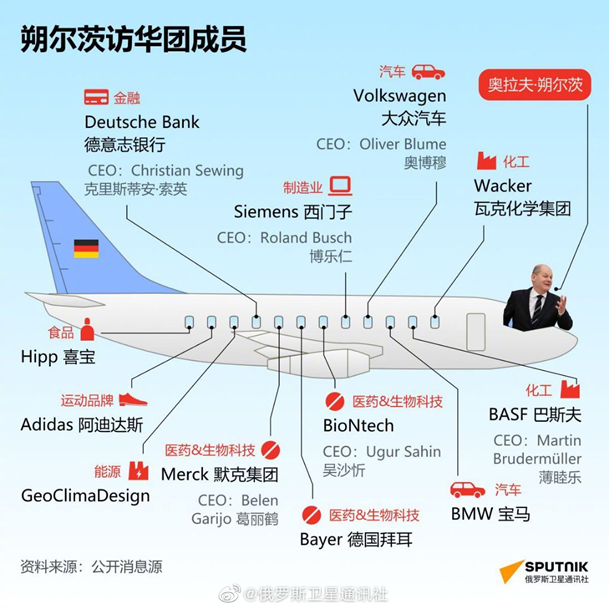 这两天德国总理访华,达成了一些成果,这也是三年来首次有欧盟国家领导人访问中国,随他而来的有一大堆德国企业的领导,包括德意志银行CEO,西门子CEO,大众汽车CEO,巴斯夫集团CEO,默克集团CEO等12家德企,下图来自俄罗斯卫星通讯社。
