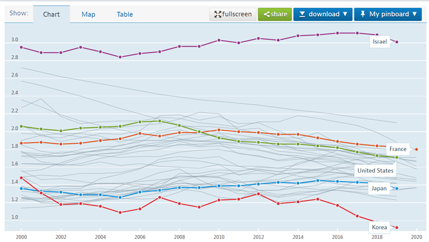 以色列是全球生育率最高的发达国家,2019年的生育率高达3.01,这主要是以色列的特殊环境,必须多生育子女,以色列保守的哈瑞迪犹太人具备超高生育率,生育率在7左右,但是他们的人口只占以色列的12.5%左右(八分之一),即使除开哈瑞迪犹太人,以色列其他人群(大部分是犹太人,另外根据2019年的人口统计以色列还有20.9%的阿拉伯裔,没错以色列这个国家有超过20%的国民是阿拉伯裔,人口超过百万)的生育率仍然2.4左右。