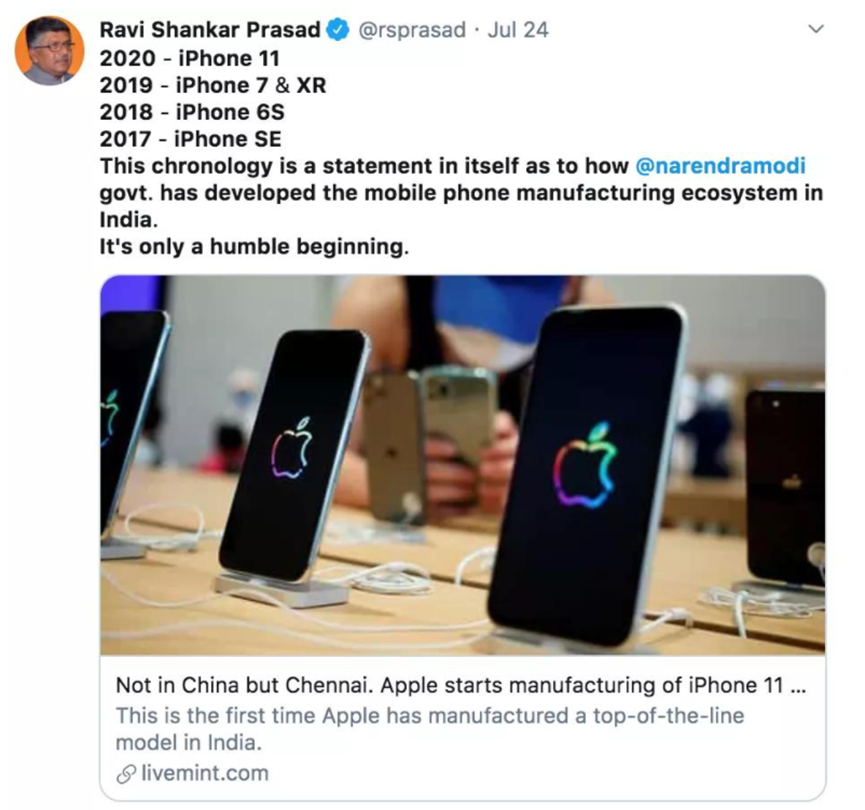 实际上根据Counterpoint的研究报告,印度市场销售的iphone手机,2018年只有17%为印度国产,但预计到2021年全年这个比例可以达到76%。同时在印度生产的iphone从几年前的零出口,到现在已经有5%可以出口到国外。