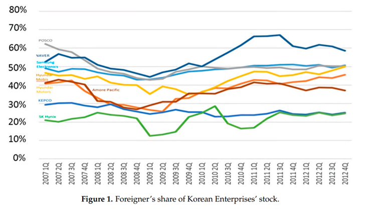 我之前写过这篇文章,其实就是讲为什么韩国会出现外资股权占比这么高的情况。