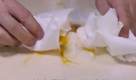 2、盐起到凝结的作用,你就可以直接用废报纸之类的把蛋液擦掉!用拖把轻轻一拖,一点残留都没有!