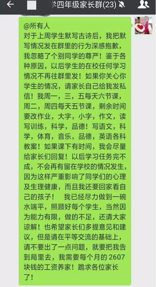 有位老师曾留言,@糖·草神仙:昨晚一夜未眠,想不通实在想不通…班里一孩子屡教不改,没办法只能放学将他留下加班陪他背书,结果家长来学校大吵大闹,告到领导那里各种编造我从未听过的可笑事由,最后结果是我泣不成声后还要道歉…我爱孩子们,我知道不能因为这一个家长而否定其他负责任的家长,但我迷茫了,我不知道自己错在哪里,我该怎么去当老师,难道真的是像别人说的那样,睁一只眼闭一只眼,别太上心苦了自己?