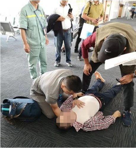 就当大家以为他会慢慢恢复时,温先生又闭上了双眼,心跳呼吸又一次停止了。李涛、陈洪贵接着开始了默契的配合。好在没一会儿,机场的急救人员带着除颤仪等设备赶来,接过了这支事关生死的接力棒。