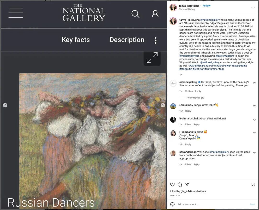 近日,知名画家埃德加·德加的作品《俄罗斯舞者》,在120多年后被英国国家美术馆改名为《乌克兰舞者》。
