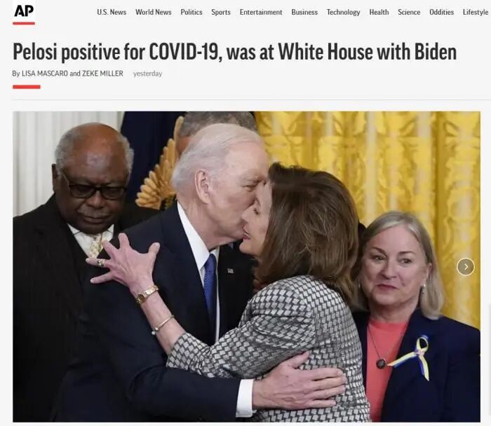 综合报道,7日宣布新冠病毒检测结果呈阳性的美国国会众议院议长佩洛西,曾在5日与美国总统拜登打招呼时互相亲吻对方脸颊。对此,白宫方面不认为此行为是密切接触,因为其不符合在6英尺距离内接触15分钟的标准。