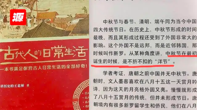 在书中称中秋节是“洋节”,作者道歉。近日,在一本题为《古代人的日常生活》的书籍中,有章节介绍中秋节和月饼起源,称中秋节是“洋节”、起源于韩国,引发了众多网友不满。8月12日,该书作者“讲历史的王老师”在微博发文道歉,他表示自己过于武断、片面,在用词上也不严谨,特别是“洋节”一词,只追求热点词汇,却造成了歧义。该作者还称自己已和出版社沟通,第一时间在本书的电子版中将相关章节删除,纸质书也会在一个月内进行全书审查删改。
