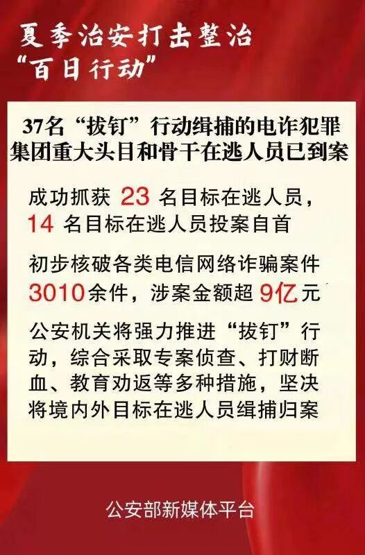 据公安部消息,截至目前,37名“拔钉”行动缉捕的电信网络诈骗犯罪集团重大头目和骨干在逃人员已到案。