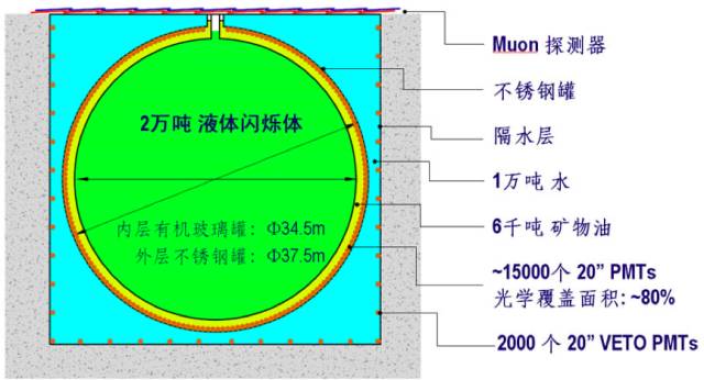 江门中微子探测器示意图,球形的中微子探测器置于水池中心,上下与四周均被2米以上的水包围以屏蔽本底。在水池顶部采用径迹探测器作为反符合探测器;水池的内壁上安放光电倍增管以探测宇宙线。图片来源:www.ihep.cas.cn
