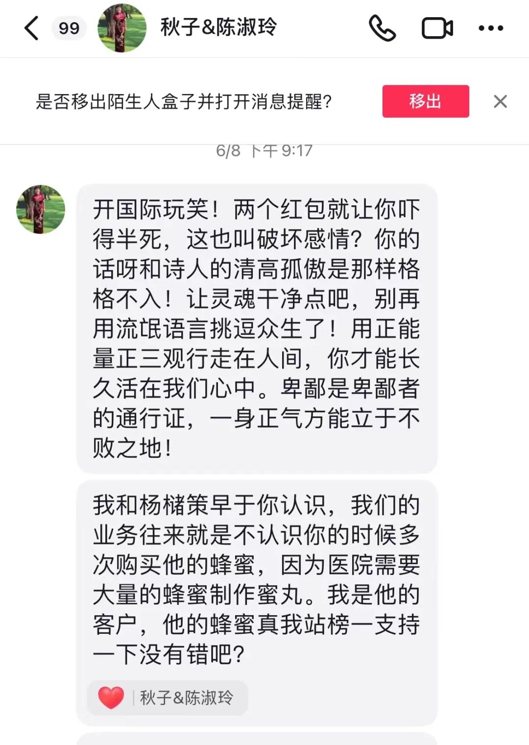 其实在要“小日子”的过程里,杨槠策是私下花了钱的,我还用这个说过事情,别人也答应了。好嘛,他开直播骂我是小三,骂我是渣女,骂我和谁谁暧昧。这一下子彻底伤害了我的心,连我横店村的人们都愤怒了。现在想起来,他侮辱怀疑我的那些朋友,他连成为别人汗毛的资格都没有。我有一个朋友,和我儿子同岁,我们认识了许多年了,他年轻但是有思想,他在我为情所困的日子里不辞辛苦地安慰我,鼓励我,我带杨槠策去北京的时候约他一起吃了个饭,他到现在还侮辱我们有一腿,其他人就不用说了。