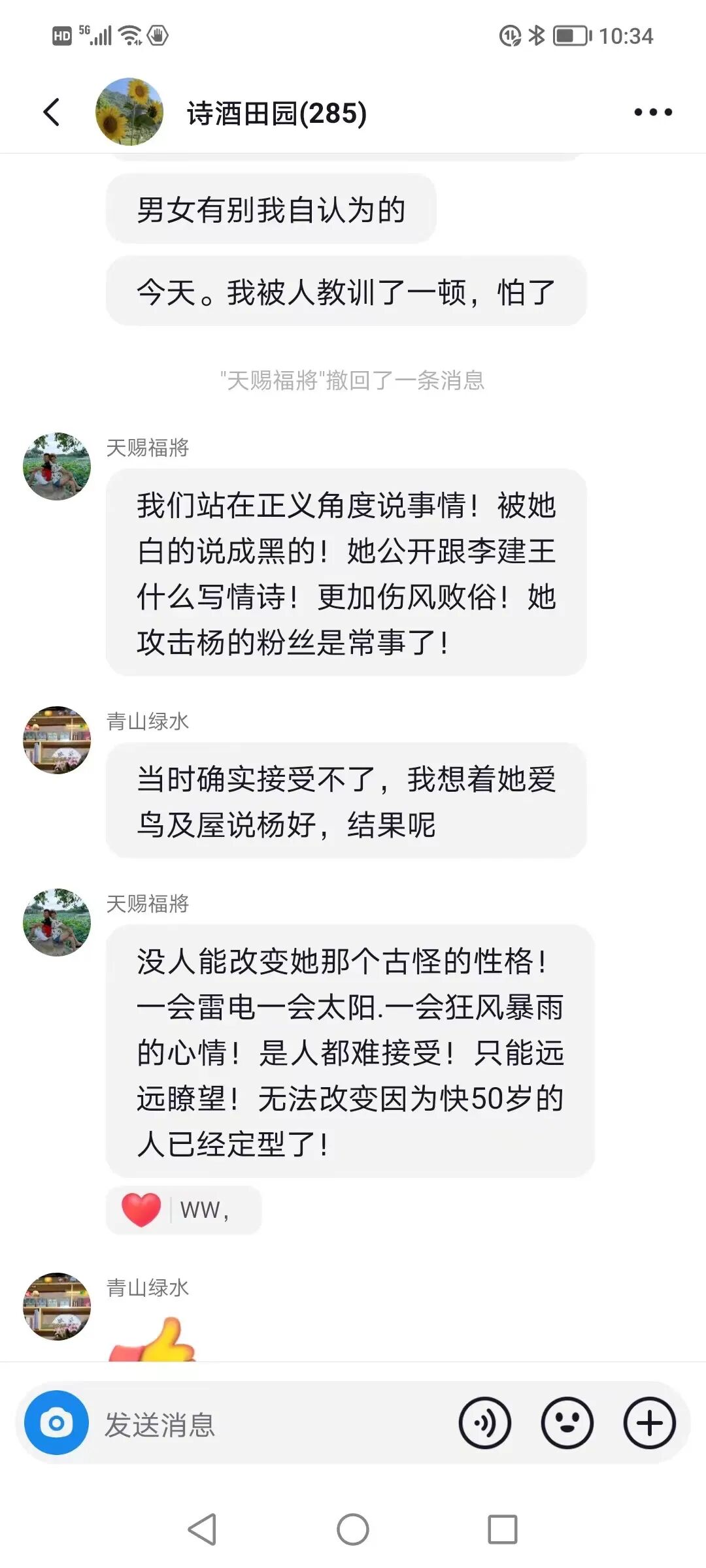 有意思的是,一天杨槠策很高兴,说现在还有一些女人向他表白。是啊,我知道有,她们觉得自己不骂人,杨槠策就不会打她们了。好,她们谁要谁拿去,反正是我丢弃的一个东西。杨槠策和他粉丝在他群里骂我,我截屏了很多页。杨槠策啊,我也曾经是你的枕边人,你怎么做到侮辱我的?你骂我嘴歪眼斜,你的粉丝群也是这样骂的,你的粉丝骂李健,你也是这样骂的。