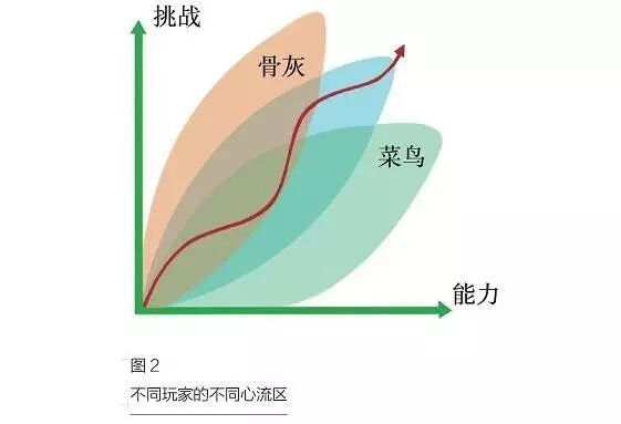 不同的电子游戏玩家有不同的技能水平,因而面对的挑战性也不同。大多数游戏仅仅提供了单一、狭窄、固定的体验(图 2 中的红线)。它可能会让那些典型的玩家留在心流区中,但对菜鸟和骨灰级玩家来说则没有太大吸引力。举例来说,对于从未玩过 3D 游戏的玩家来说,一个简单的动作(比如在 3D 空间中移动视窗)就可能让他们感到挫折。尽管游戏的其他部分可能跟 2D 游戏一样吸引玩家,但这种上手时的挫折很可能会赶走这些玩家。
