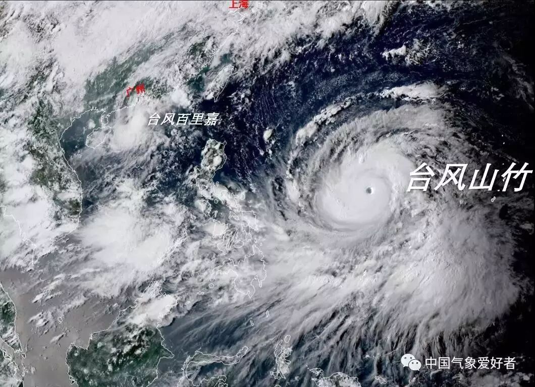 9月12日山竹和百里嘉对比,分别来自风云4号、向日葵8号云图,中气爱标注