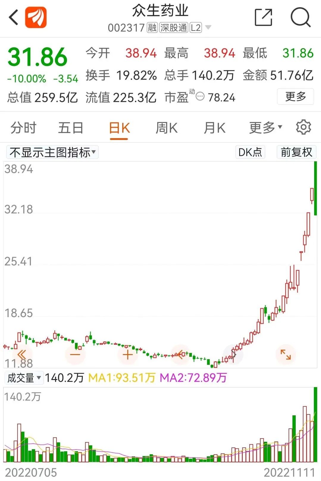 值得注意的是,众生药业今日盘中一度封涨停,午后突然跳水跌停,上演“天地板”走势。该股近日持续走高,9月27日至昨日收盘,累积大涨近2倍。