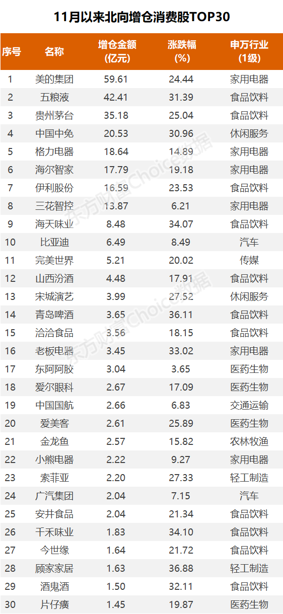 具体来看,“家电茅”美的集团排第一,北向11月以来增仓近60亿,11月以来涨幅24%;五粮液排第二,北向增仓42亿元,11月以来涨幅超31%。