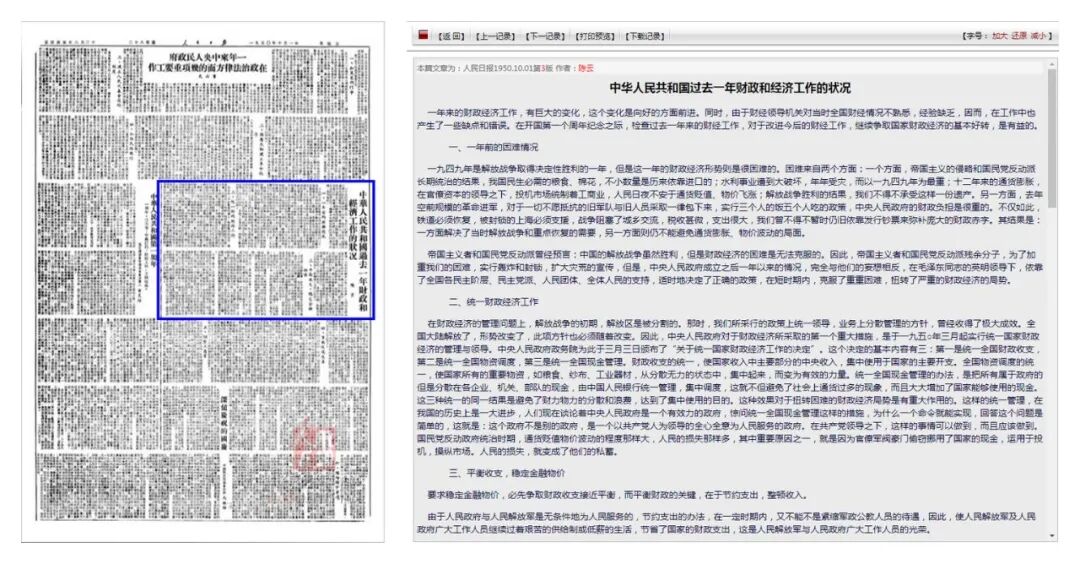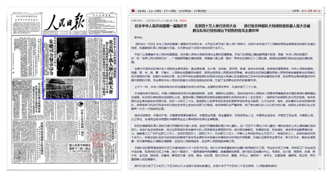 选择按“时间段”检索,输入起止时间“1950.10.01和1950.10.02 ”即可检索出1950年10月1日和2日刊登的所有文章