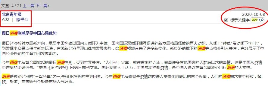勾选右上角“标示关键词”,突出显示关键词“国庆”和“消费”